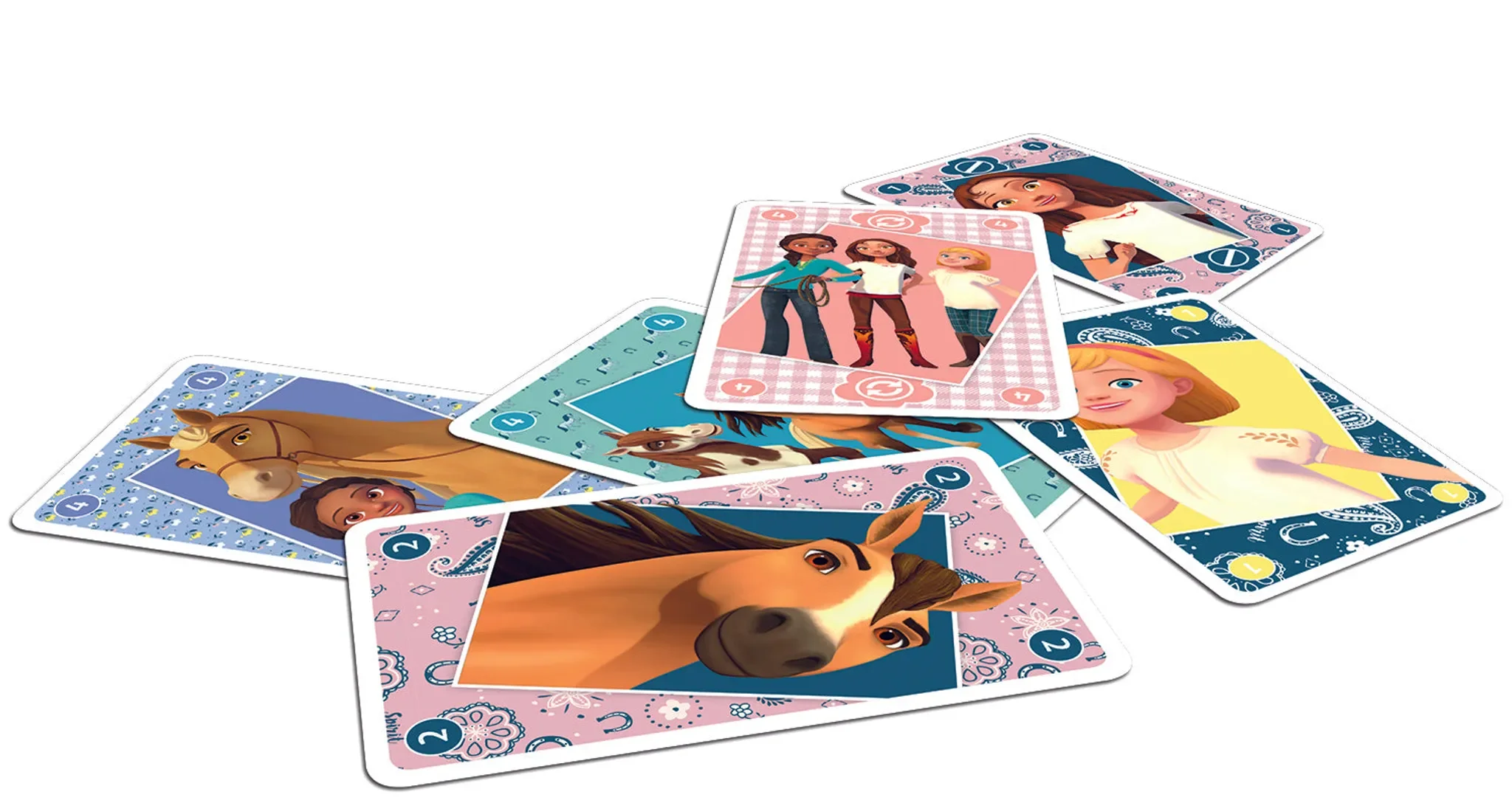 Mit der Spielebox „Spirit – Wild und Frei“ tauchen Kinder in die Welt von Lucky, Abigail und Pru ein und erleben pferdestarke Abenteuer am Spieltisch. Das vielseitige Kartenset bietet gleich vier beliebte Kartenspiele in einer kompakten Packung und sorgt für abwechslungsreichen Spielspaß.