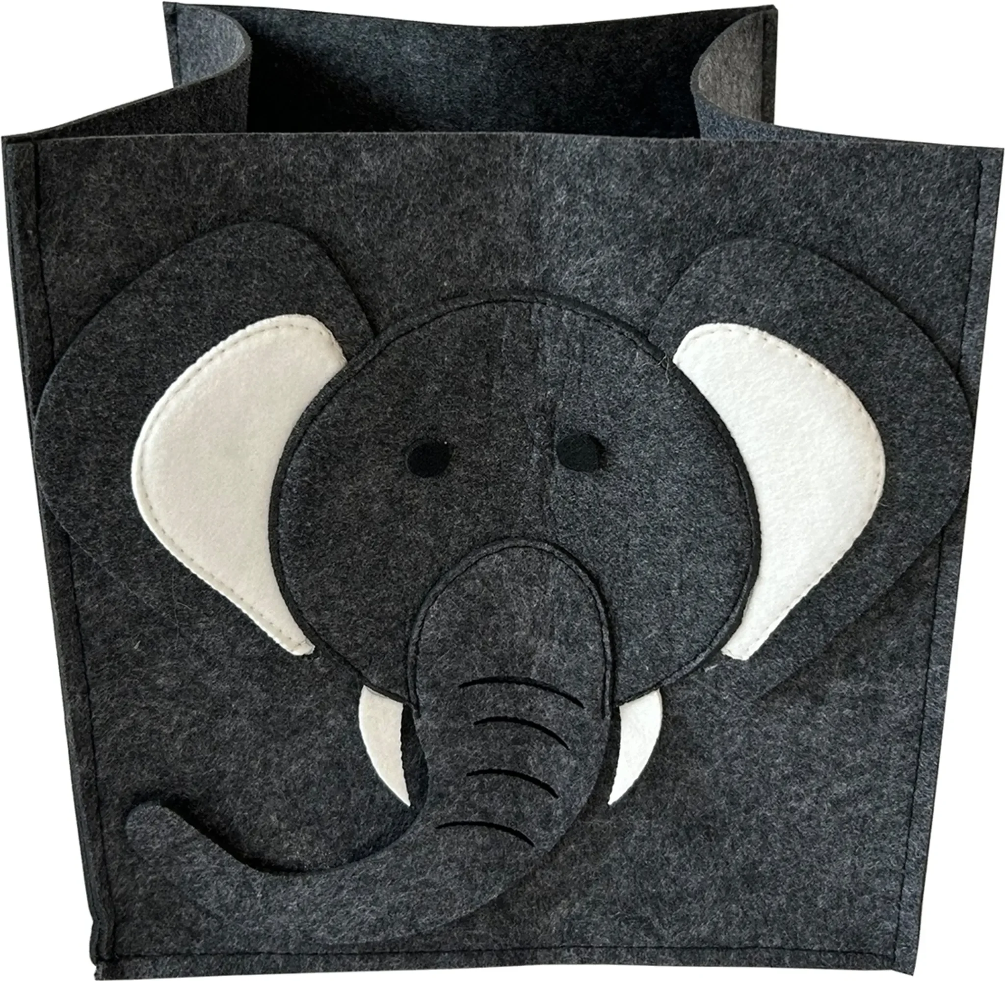 Dieser eckige Aufbewahrungskorb aus Filz bringt spielerische Ordnung ins Kinderzimmer. Die liebevolle Elefanten-Applikation macht den Korb zu einem dekorativen Blickfang und sorgt gleichzeitig dafür, dass Aufräumen auch für Kinder Freude bereitet.