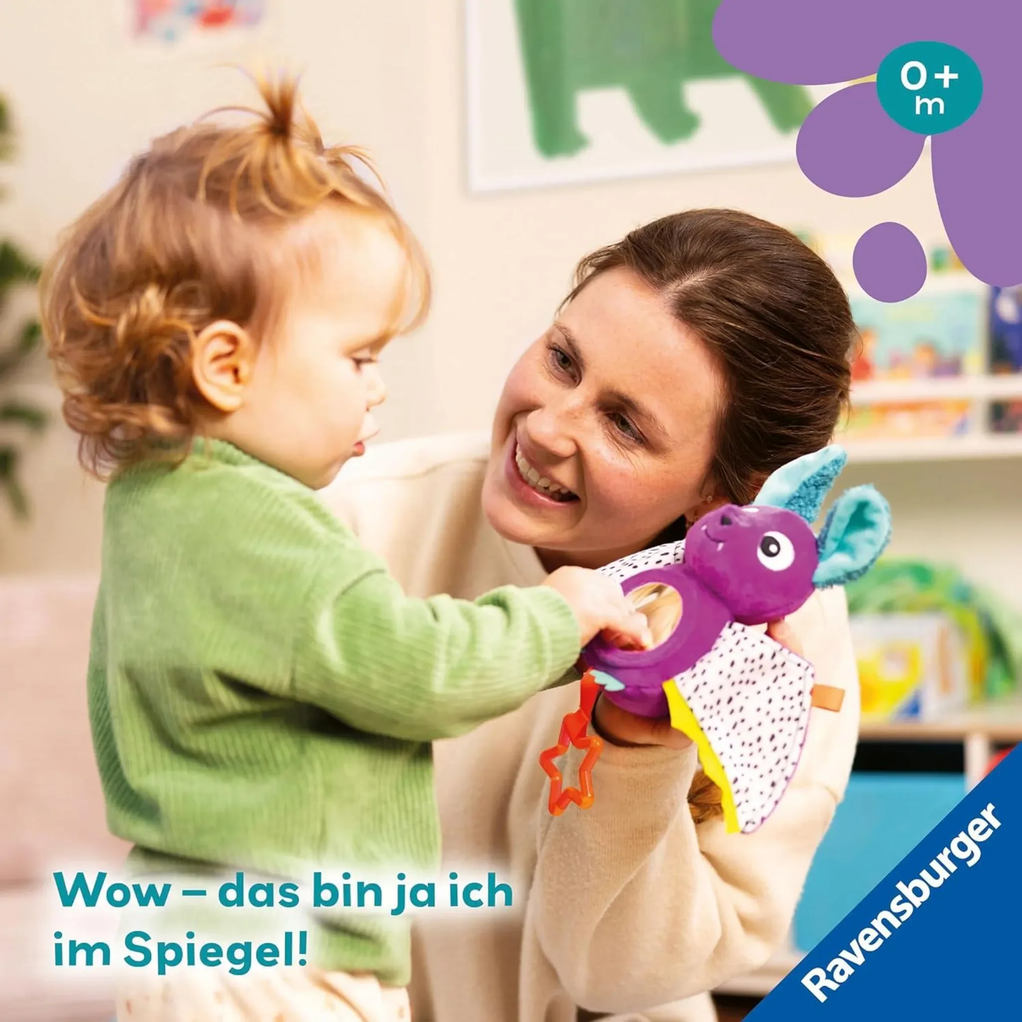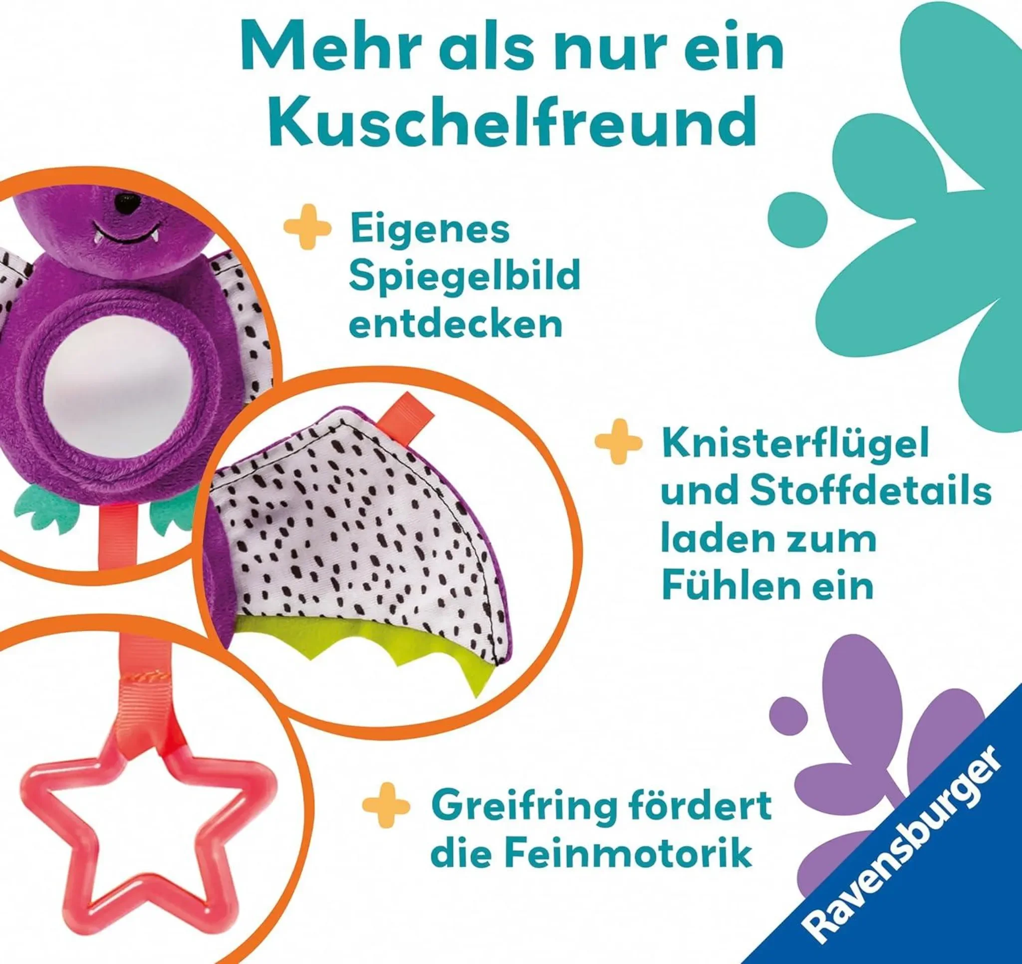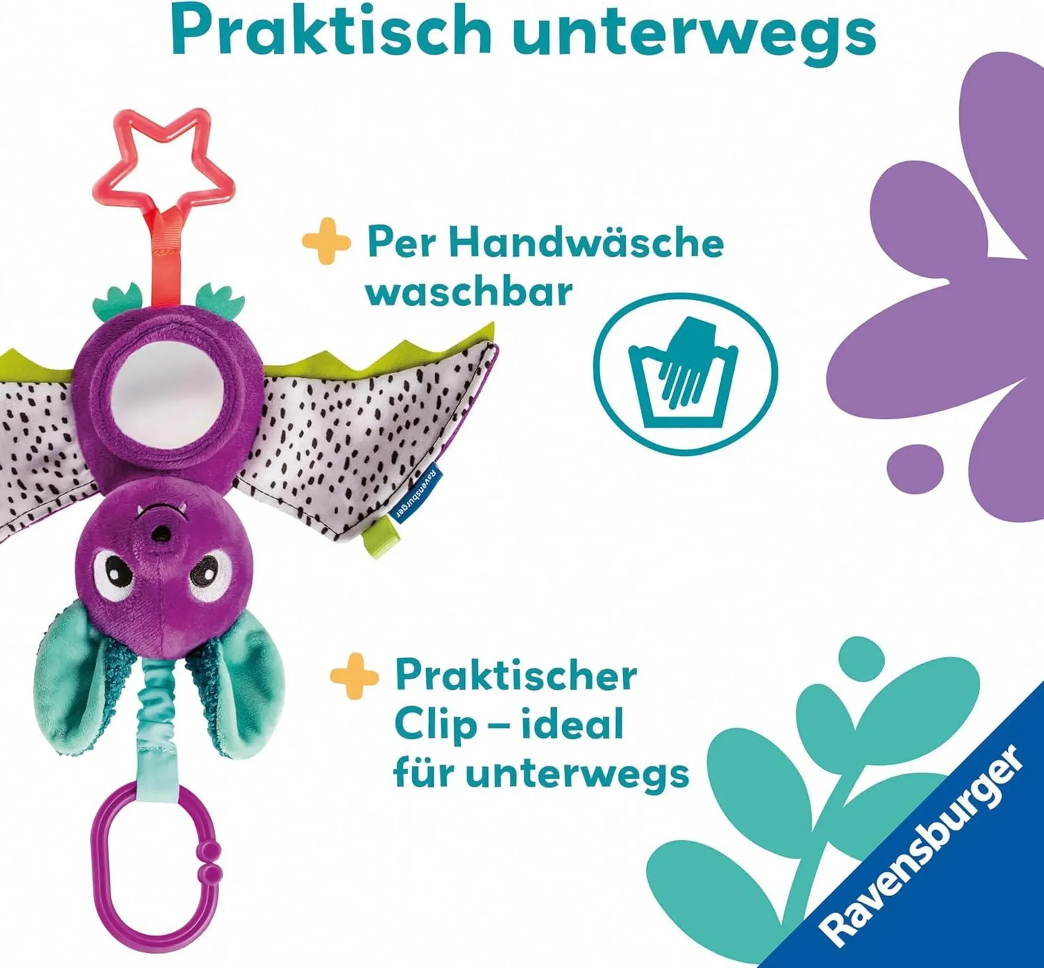 Spannende Geräusche und die abwechslungsreiche Oberflächenstruktur fördern die Wahrnehmung und Feinmotorik auf spielerische Weise. Dank des praktischen Clips lässt sich die Activity-Fledermaus einfach am Kinderwagen, an der Babyschale oder Tasche befestigen – ideal für zuhause und unterwegs.