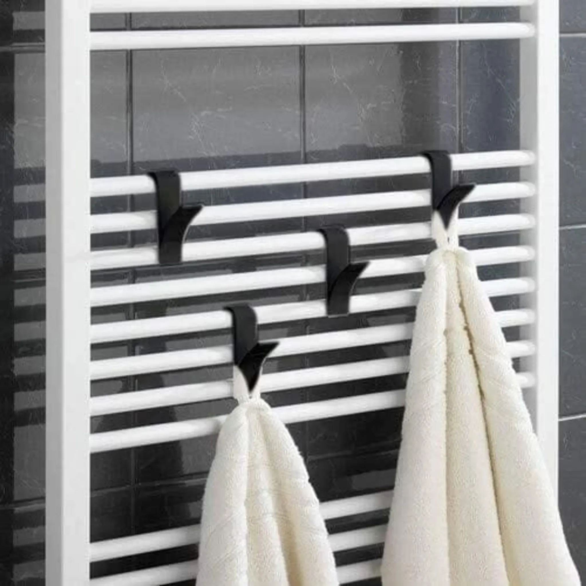 Die Haken bestehen aus langlebigem Kunststoff und sind beidseitig nutzbar – je nach Heizkörpertyp kann der Haken gedreht verwendet werden. Durch die neutrale Farbgebung fügen sie sich unauffällig in jedes Badezimmerdesign ein.