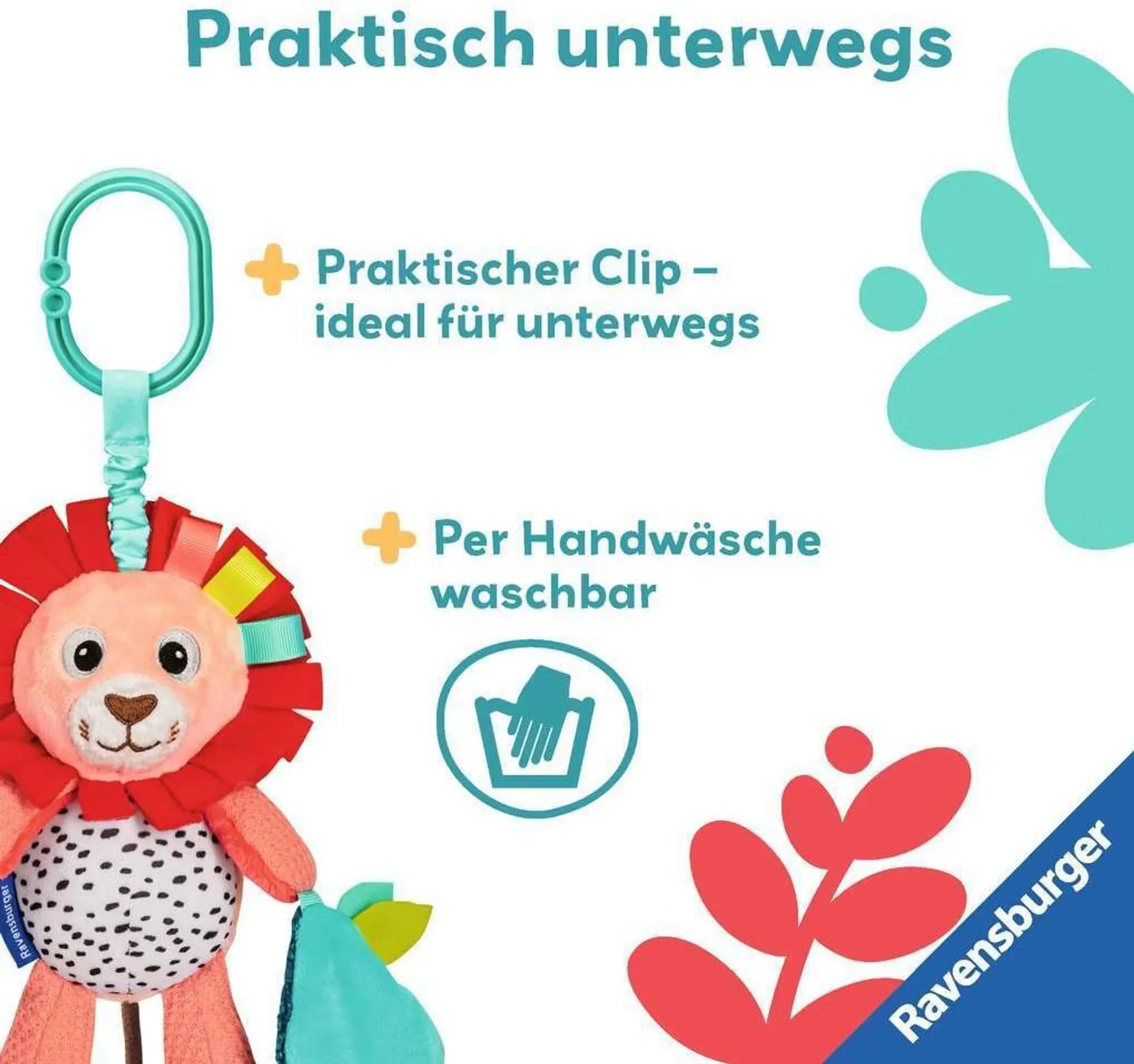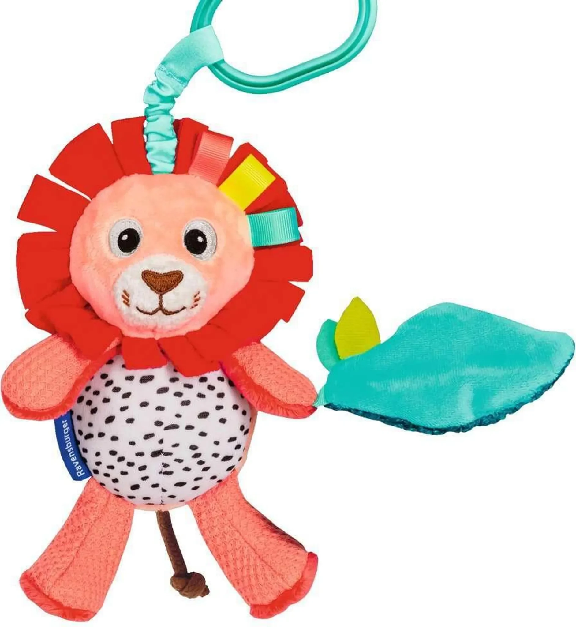 Hochwertige, kontrastreiche Materialien sprechen mehrere Sinne an und machen den Löwen zu einem spannenden Begleiter für unterwegs. Dank des praktischen Clips lässt sich das Spielzeug einfach an Babyschale, Kinderwagen oder Tasche befestigen.