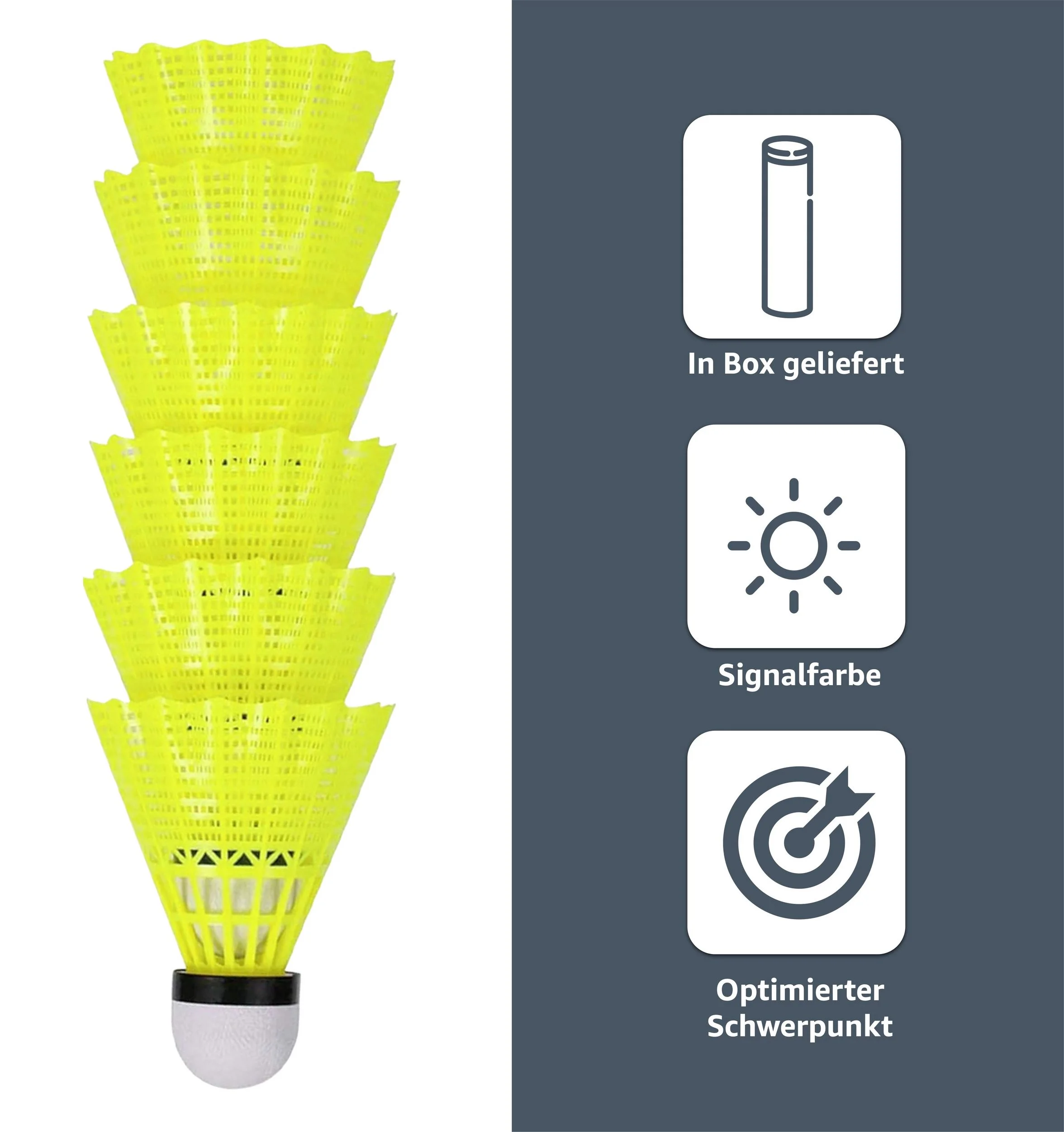 Dank der robusten Nylonstruktur bieten die Federbälle exzellente Haltbarkeit, während der optimierte Schwerpunkt für eine stabile Flugbahn sorgt. In der praktischen Aufbewahrungsbox lassen sich die 6 Bälle sicher transportieren und lagern – ideal für Training, Verein oder den Familienausflug.