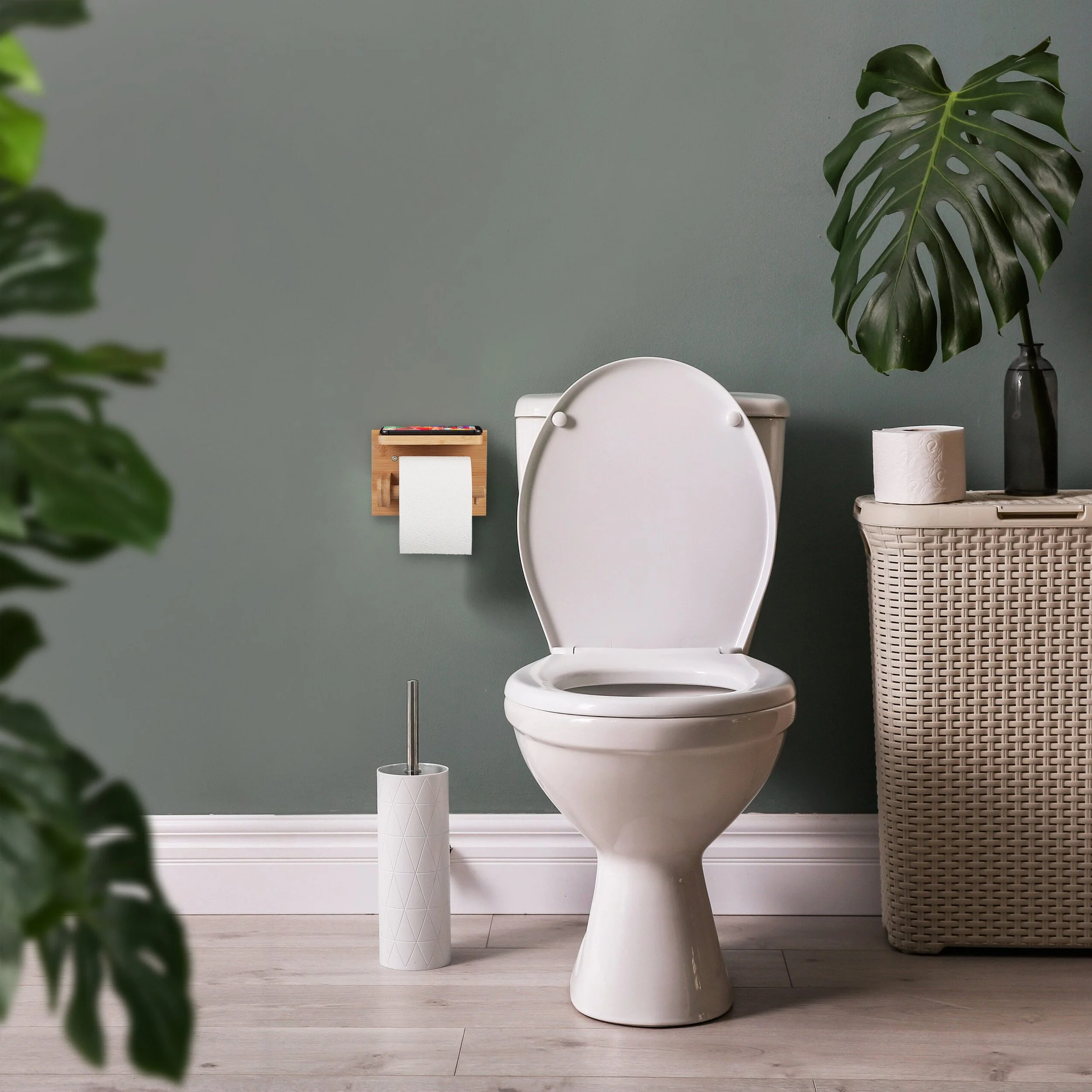 Dank der Wandmontage bleibt die Fläche rund um die Toilette frei und ordentlich. Der feuchtigkeitsresistente Bambus sorgt für Langlebigkeit, während die einfache Befestigung per Schrauben eine sichere Nutzung garantiert.